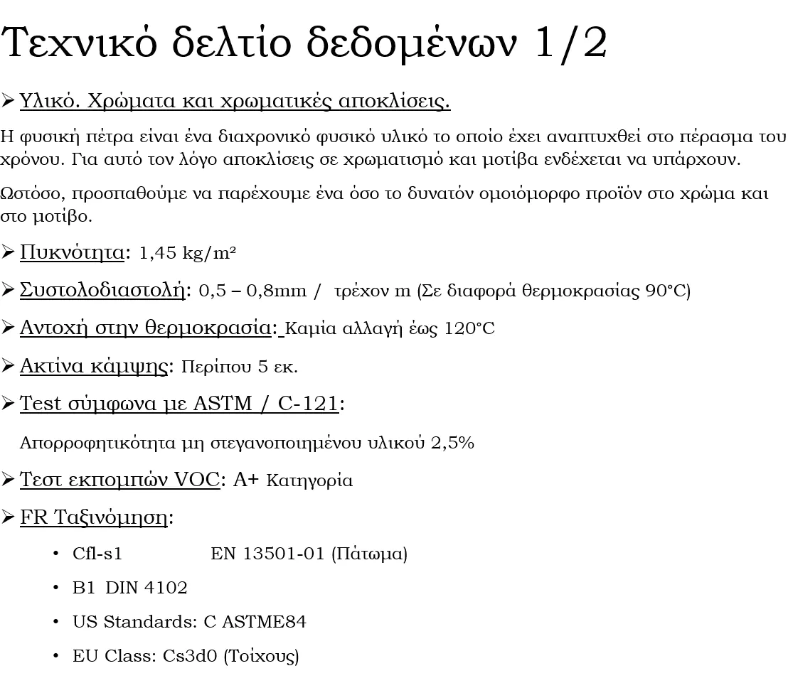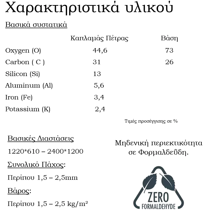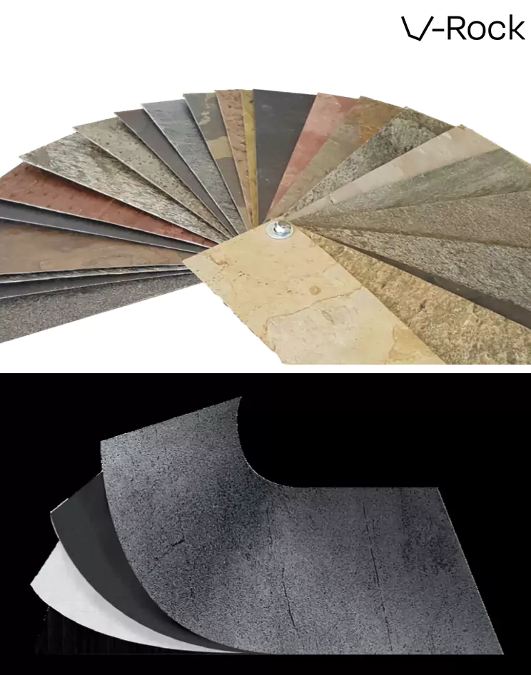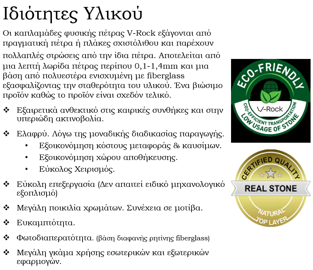 Την λύση ήρθε να δώσει ένα επαναστατικό βιώσιμο υλικό. Ένας ελαφρύς, εύκαμπτος, πολύχρωμος και μοναδικός καπλαμάς πέτρας. Κάθε φύλλο αποτελείται από ένα λεπτό στρώμα πραγματικής πέτρας. Με παραλλαγές υφής και χρώματος, όπως και η πέτρα, με απεριόριστες δυνατότητες εφαρμογής. Μπορεί να χρησιμοποιηθεί για να δημιουργήσει μια ρεαλιστική μονολιθική εμφάνιση μεγάλης πέτρας, ενώ προσφέρει εξοικονόμηση κόστους λόγω του μικρού βάρους και της γρήγορης επί τόπου εγκατάστασης.